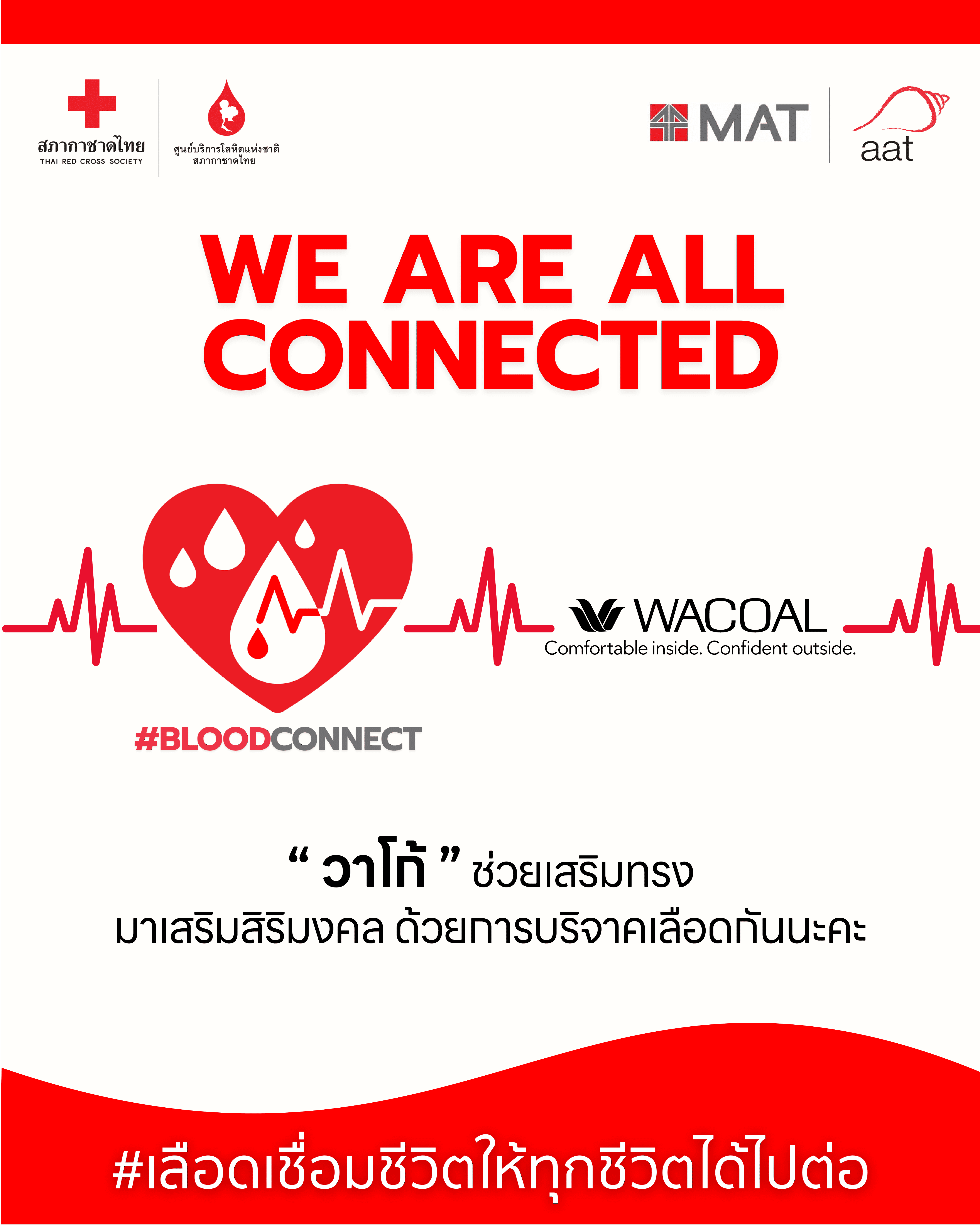 แคมเปญ #BLOODCONNECT เกิดจากความร่วมมือของ 3 ภาคีหลัก ได้แก่ ศูนย์บริการโลหิตแห่งชาติ สภากาชาดไทย สมาคมการตลาดแห่งประเทศไทย (MAT) และสมาคมโฆษณาแห่งประเทศไทย (AAT) ที่รวมพลังกับภาคเอกชนชั้นนำกว่า 900 แห่งทั่วประเทศ ภายใต้แนวคิด “We Are All Connected – เลือดเชื่อมชีวิต … ให้ทุกชีวิตได้ไปต่อ” เพื่อผลักดันให้เกิดวัฒนธรรมการให้ที่ยั่งยืนในอนาคต
