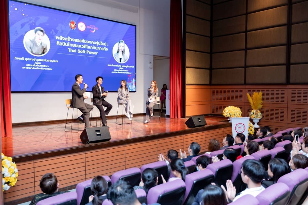 หลังการแถลงข่าวได้มีเสวนาต่อเรื่องของ Soft Power ของไทยในเวทีโลก โดย 2 นิสิตปริญญาโท จากวิทยาลัยนวัตกรรมสื่อสารสังคม ได้แก่ เซ้นต์ ศุภพงษ์ อุดมแก้วกาญจนา และ ออม กรณ์นภัส เศรษฐรัตนพงศ์ 2 นักแสดงที่ได้มีโอกาสนำเสนอความเป็นไทยผ่านซีรีส์และทัวร์คอนเสิร์ตในต่างประเทศ โดยทั้ง 2 คน ได้แลกเปลี่ยนความคิดเห็นไว้ว่า ความเป็นไทยมีหลายรูปแบบ ทั้งอาหาร กีฬา หรือสถานที่ท่องเที่ยว โดยเฉพาะที่ถูกนำเสนอผ่านซีรีส์ เพราะทำให้นักท่องเที่ยวได้รู้จักความเป็นไทยผ่านสิ่งเหล่านี้ นอกจากนี้ทั้ง 2 คนยังได้เล่าความรู้สึกของการเป็นนิสิต มศว ตั้งแต่ปริญญาตรีจนถึงตอนนี้ที่กำลังศึกษาปริญญาโทอยู่ว่า มศว เป็นมหาวิทยาลัยที่เปิดกว้างทั้งความคิด กิจกรรม และการใช้ชีวิต และการเรียนต่อปริญญาโทก็หวังว่าจะทำไปใช้ในการทำงานในวงการบันเทิงต่อไปในอนาคต